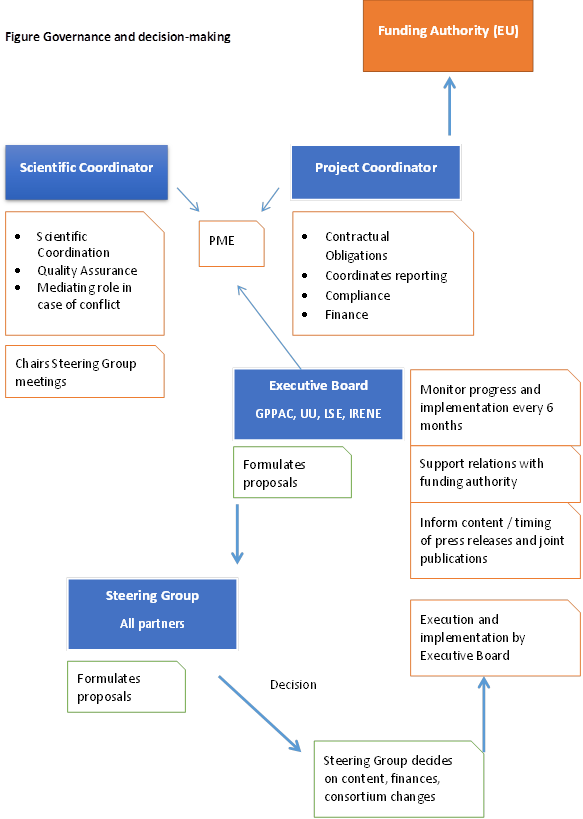 The Executive Board as the supervisory body for the execution of the WOSCAP project shall report to and be accountable to the Steering Group. It is composed of the Work Package leaders: GPPAC, UU, LSE and IRENE.